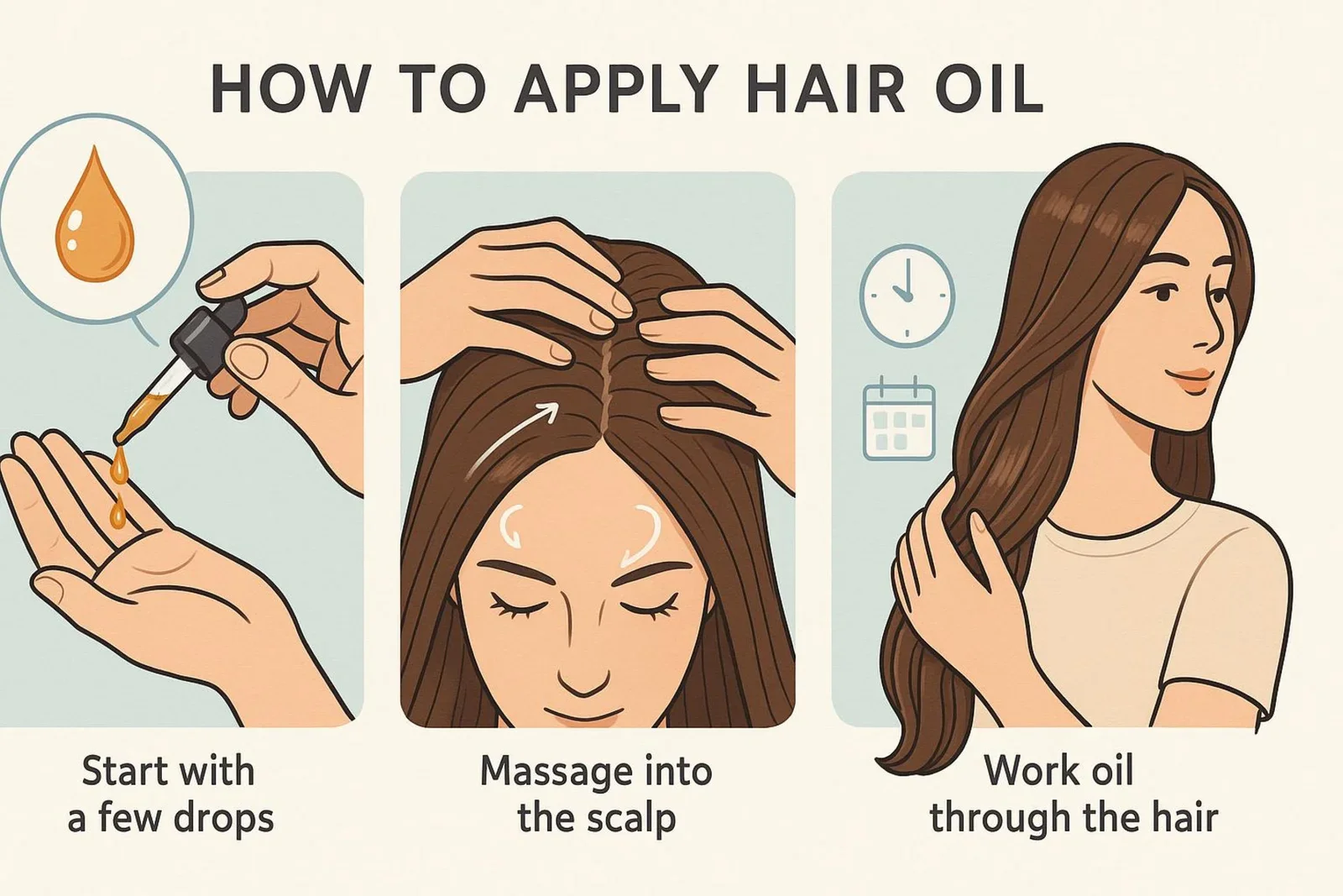 Pick an oil that matches your hair’s needs. Start with little-a few drops (about the size of a coin) and use more only if needed. Fine hair needs less; thick or curly hair may need more, but always add slowly.