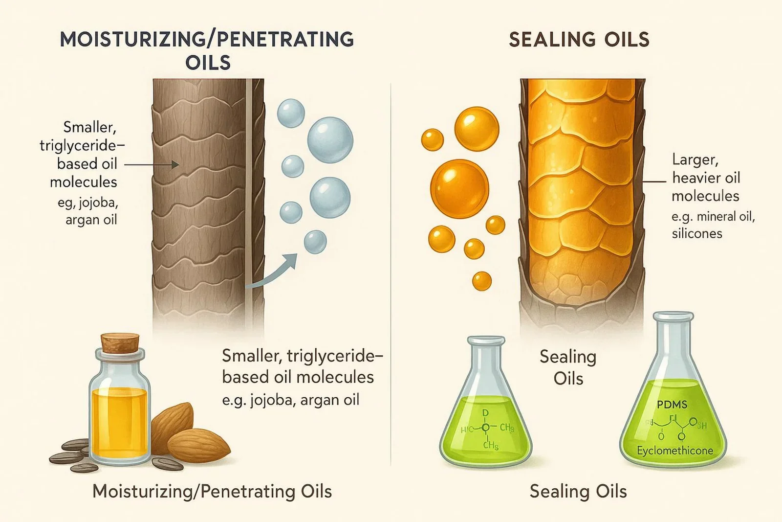 Hair oils don’t all work the same way. They can either soak into the hair, giving deep moisture and nutrients, or sit on top to seal in moisture and stop damage. Here’s how they differ: