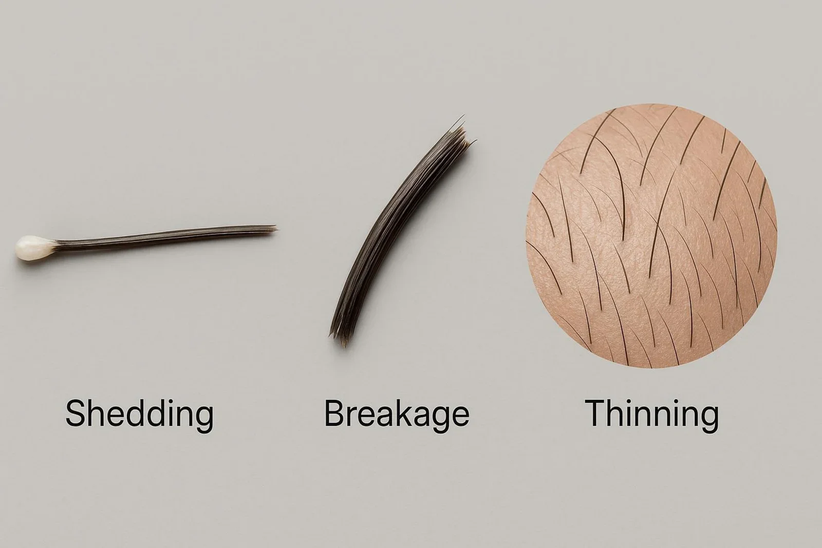 Breakage is snapped hair along the shaft with no root attached. You’ll find shorter pieces in your brush, on your shoulders, or in the shower. This often stems from heat, chemicals, or rough handling.