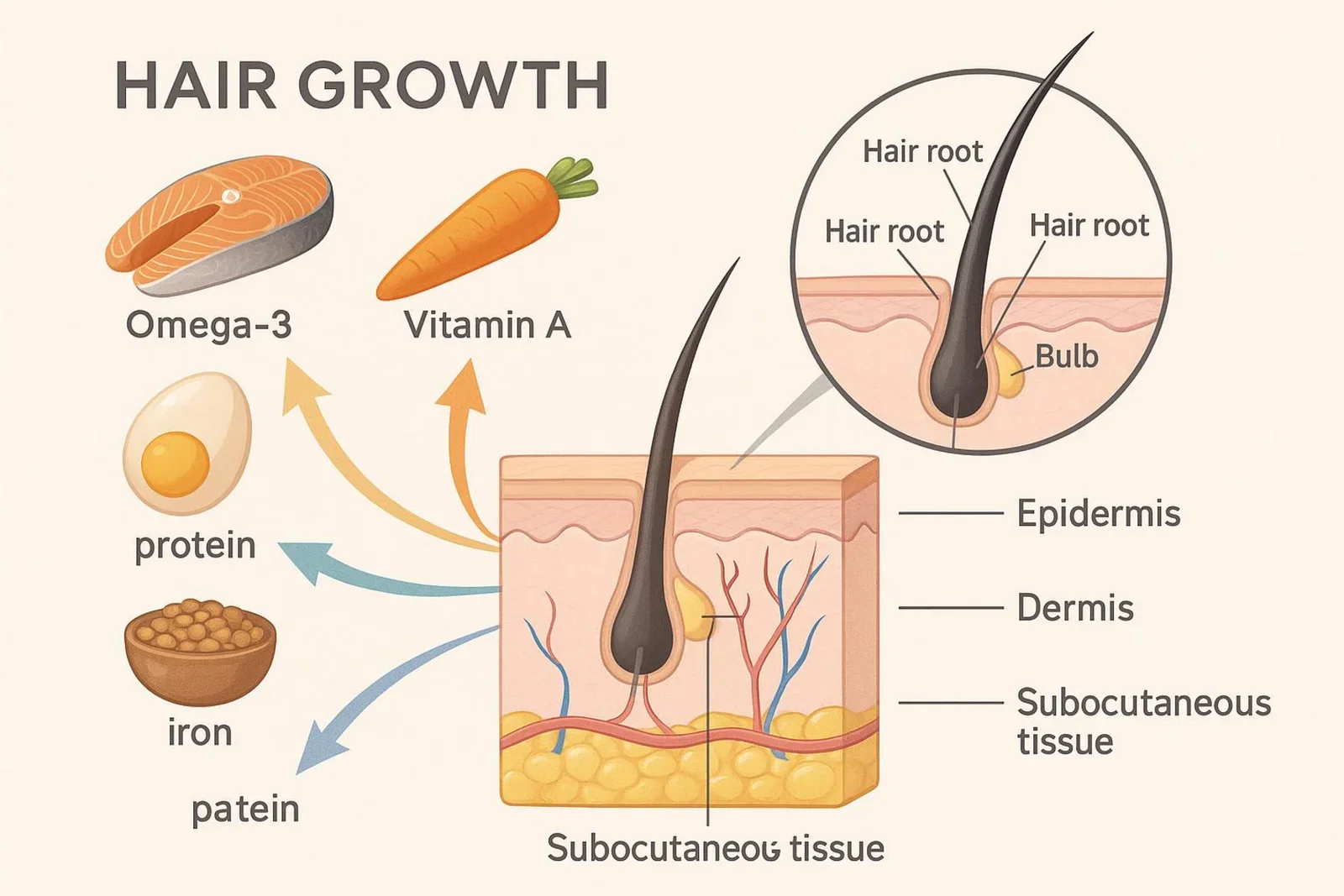 Protein is the foundation, giving hair its structure. Healthy fats keep the scalp moist and the hair shiny and bendy. Vitamins and antioxidants shield hair from damage. When your food doesn’t supply enough of these things, your body focuses on more important organs and leaves your hair undernourished, which can cause extra shedding or slow growth.