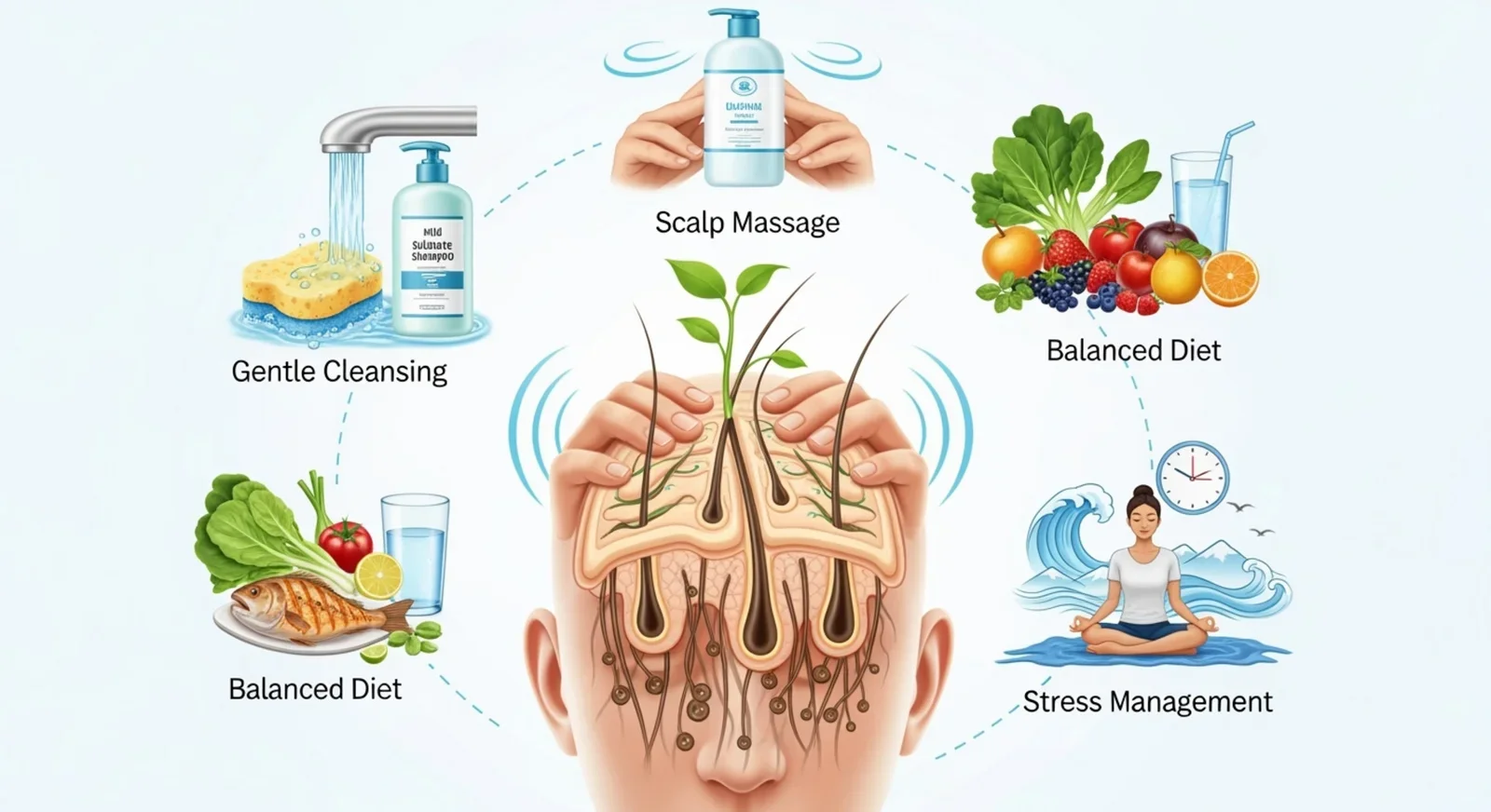 Regular gentle washing, exfoliating, moisturizing, and scalp massage all help maintain scalp health.